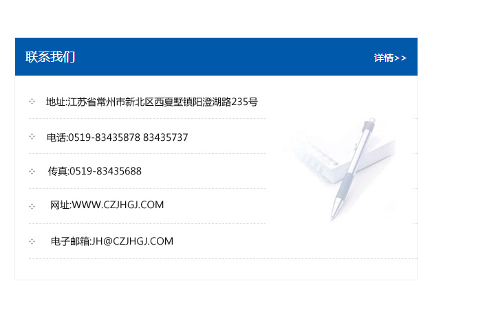地址:常州市新北區友邦商務大廈1幢16、17層  電話:0519-85101652  傳真:0519-85112595  郵編:213022  網址:www.cz-jiayue_cn.leffeck.net  郵箱:xiajifengaa@163.com